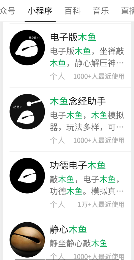 正如雨流和不加糖所言,“电子木鱼”类游戏没有太多开发难度,用各类编程语言都能实现,即使没有做过游戏的程序员稍微研究一下也能做出差不多的软件。所以在相关梗流行起来后,大量的电子木鱼就冒了出来。抖音、快手、微信小程序等无一例外。