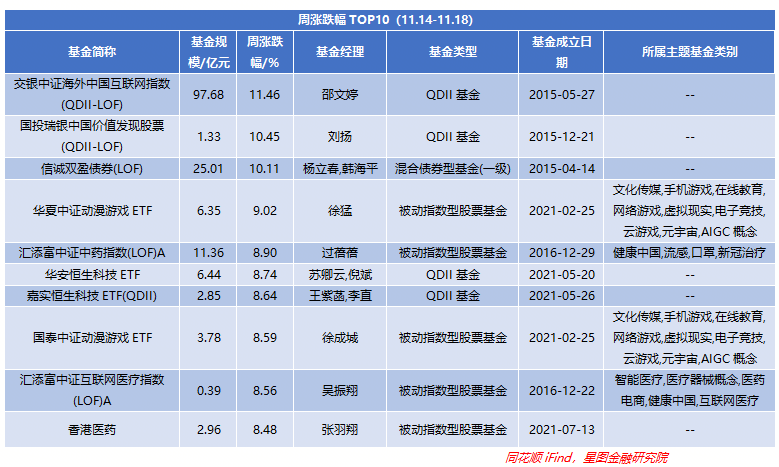 从涨跌幅(A/C基金以A类或排名靠前为准,QDII美元/人民币以排名靠前为准)TOP10来看,被动指数型基金和QDII基金表现不错,前者5只,后者4只,剩余1只为固收+型基金;主要在于海外中概股逆势上涨,且相关基金也主要是文娱、医疗相关。整体涨幅则出现回暖至0.78%,环比+0.46pct,但仍保持正增长。最高涨幅再次回落1.35pct至11.46%,为交银基金旗下基金。