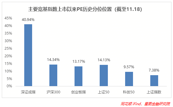 从上市以来分位值来看,上周几大指数估值均实现上修,尤其是上证50在成份股的带动下环比改善幅度最大,而深证成指分位数跨过40%,估值已然比较合理,科创50、上证指数依然在10%以下,而科创50近期反弹明显,也具备了中长期配置价值。