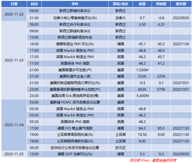 美国方面,中期大选共和党掌控众议院,前总统特朗普在佛罗里达州海湖庄园正式宣布参加2024年总统竞选;美联储主要官员称对12月放慢加息持开放态度,12月加息可能进一步放缓至50BP。