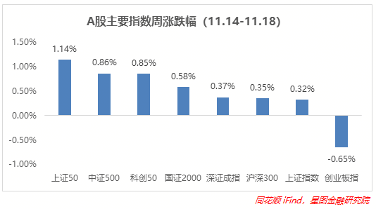 上周A股整体再次震荡上探,涨多跌少,而且大部分指数涨幅都有所扩大,上证50再次领涨,涨超1%,主要受到权重股券商、白酒、银行、地产等反复拉升所致,但是煤炭周内跳水,上证指数、沪深300涨幅受限,都在0.4%以内,而周内专精特新标的政策力度较大,所以科技成长属性的科创板表现居前,达到0.85%,新能源赛道整体回调,创业板表现最差,也是唯一收跌的指数,跌幅达0.65%。其余指数涨幅都在0.3%-0.9%之间。