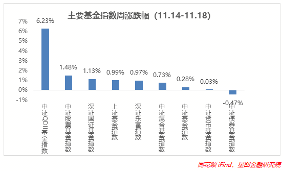 上周基金表现环比改善,受益于港股大涨,所以QDII基金再次领涨,且涨幅大幅扩大,涨超6%,环比+4pct左右,深系基金指数同样由跌转涨,环比均+1pct以上;国内A股市场表现相对较差,所以上证系、中证系涨幅上并不占优,但是环比依旧扩大,均涨超1%左右;债基跌幅较深,主要受权益市场抢占资金、债券利率上行、全市场货币收紧等的影响,上周收跌0.47%;货基变化不大。