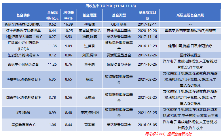 上周基金收益率(A/C基金以A类或排名靠前为准,QDII美元/人民币以排名靠前为准)TOP10中5只是主动权益型基金,剩余包括4只指数型基金、1只QDII型基金。主要在于内地权益市场表现较好,与此同时医疗、文娱、汽车领域在政策面、基本面利好,而美债利率下行使全球债券价格上涨,所以与之相关的QDII基金领涨;但指数实现上涨,所以基金整体收益也小幅回升至-0.25%,环比+0.27pct。从风格上来看,小盘成长型基金领涨。上周长信基金旗下的QDII基金收益最高,达到了16.39%,环比+0.33pct,表现较好,其余基金均在8%以上。