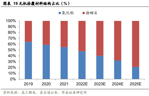 现阶段,无机涂覆隔膜占据绝大部分市场份额,占据统治地位,远远超过有机涂覆隔膜。高工产研锂电研究所数据显示,2021年的涂覆隔膜出货中,95%以上为无机涂覆;其中,勃姆石2021年实现出货量1.8万吨,同比增速120%,渗透率已经超过60% [8]。
