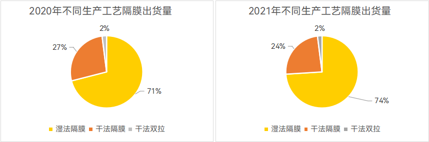 从出货量看,当前的湿法隔膜与干法隔膜市场份额差距巨大。2021年,湿法隔膜出货量占比高达74%,较2020年提高3%;同期的干法单拉/双拉的占比分别为24%/2% [6]。在2022年上半年,湿法隔膜占比进一步提高5个百分点,达到79% [7]。这种趋势主要是由于下游动力电池企业对电池性能的要求不断提高,湿法隔膜的产品优势被持续放大,隔膜企业为满足需求不断增加湿法产能,而干法尽管在一定程度上受益于储能产业的扩产,但增速仍然不及湿法,导致出货量占比持续下滑。但总体来说,隔膜市场仍然是典型的增量市场,无论是干法还是湿法都在增长,不存在出货量下滑的情况。