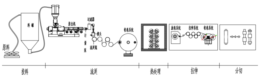 干法:又称熔融拉伸法,是指将高分子聚合物(主要为PP)和添加剂原料混合制成熔融物,挤出流延后形成片晶结构,再经过热处理得到硬弹性的聚合物膜,在一定的温度下拉伸形成狭缝状微孔,热定型后制得微孔膜;