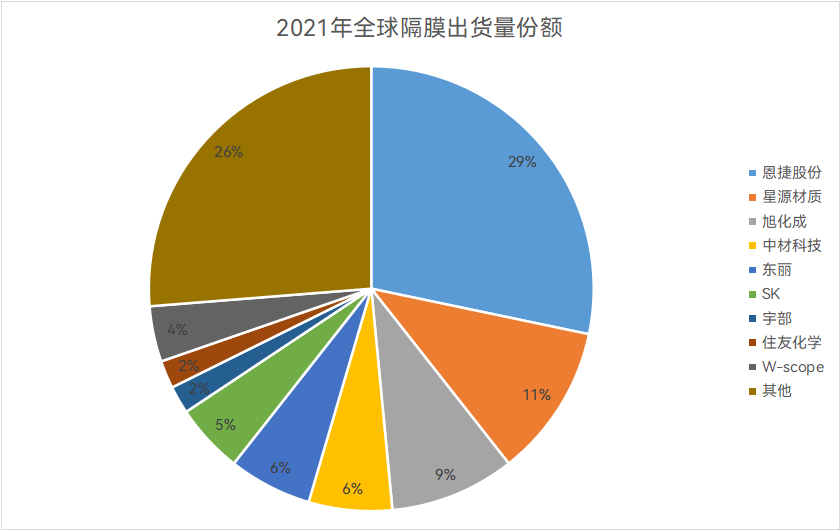 市占率方面,受益于资金、技术、成本、客户等方面的综合优势,国产隔膜在全球市场占比高,且仍在快速扩张。2021年全球隔膜出货量108亿平,同比增长72%,其中我国隔膜出货量占72%,较2020年提升12个百分点,其中恩捷、星源、中材三家企业合计出货就达到49亿平,占全球份额的45%。中国本土企业同时贡献了全球隔膜行业的绝大部分增量:2021年全球隔膜出货增量为45.2亿平,其中 40.8亿平,约90%来自国内企业 [11]。
