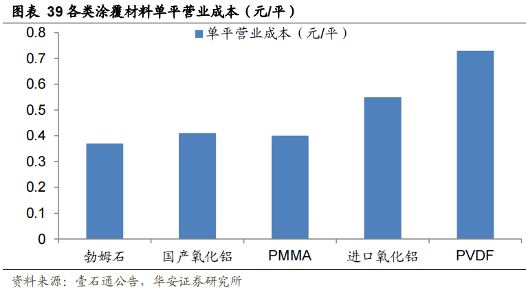 在众多材料中,勃姆石凭借更加出色的性能及经济性,为现阶段受关注涂覆材料。勃姆石作为一种新兴的陶瓷涂覆材料,核心性能指标均优于早期比较主流的氧化铝,且国产化程度高,而氧化铝存在如硬度大、成本高、对设备磨损严重等问题,制约了其发展潜力,因此勃姆石正在对氧化铝形成快速替代。成本方面,勃姆石凭借物料成本低,以及搭配同样低成本的水性溶剂,成为了所有涂覆工艺中单平成本最低的加工路线,性价比优势相当突出。