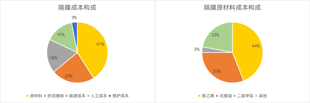 隔膜的成本主要包括原料成本、能源成本、人工成本及折旧摊销等。其中原料成本占比最大,约为41%,主要为制作隔膜所需的主材和辅助材料,其中包括主材PE、PP和辅材石蜡油(白油)、二氯甲烷等等,合计占比近80%;高占比的折旧摊销,则是受隔膜行业设备成本格外高影响,这一点将在下文详述 [3]。