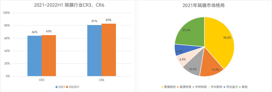 2021年,中国锂电隔膜的前三名公司市占率(CR3)高达64%,CR6则为81%;在2022年上半年,伴随着新增产线投产,行业集中度进一步提高,CR3/CR6分别提升至65%/83% [12]。