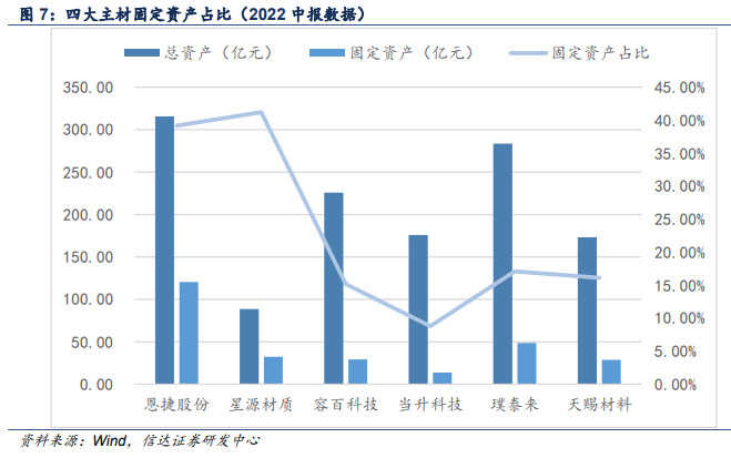 首先,电池隔膜是非常典型的重资产行业,固定资产占比显著高于其他电池主材。以信达证券整理的6家具有代表性的电池主材上市公司为例,隔膜制造商恩捷股份和星源材质的固定资产占比约为40%,远远高于其它细分领域企业 [4]。