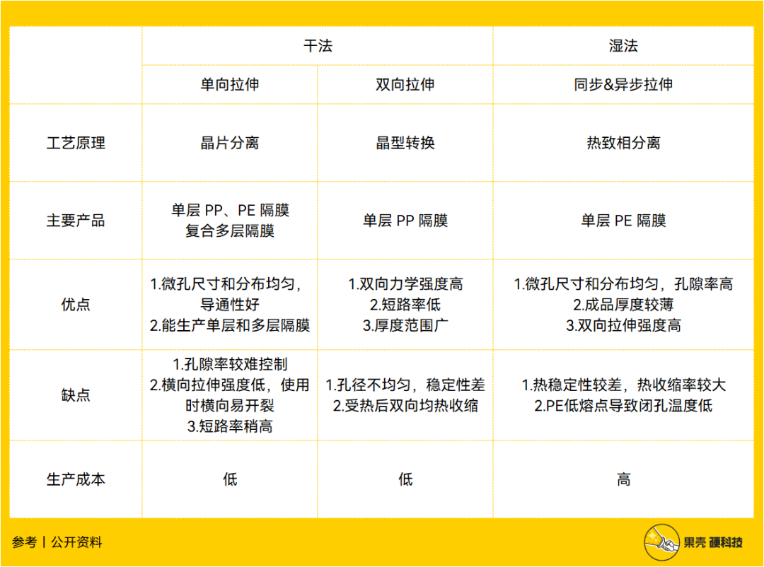 干法工艺的核心原材料为PP,且生产设备的国产化已经基本完成,所以成本比较低,因几乎没有热收缩现象而具有较高的安全性,但最终产品的横向强度较差、微孔尺寸和分布不均匀,稳定性不高。干法隔膜适用于对成本敏感,但对能量密度要求不高的应用场景,譬如储能市场。双向拉伸由于只能生产单层隔膜,且各方面性能指标也不出众,下游用量很少,市占率很低。