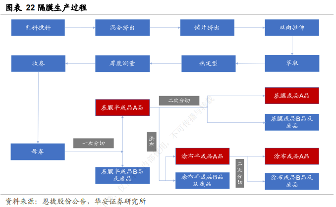 隔膜的另一个重要特征, 是生产难度大,对企业的工艺水平有很高要求,行业的技术壁垒较高。隔膜的工艺流程远比其它电池主材复杂,工序不但很长,其中不少环节对精度的要求也很高,这导致隔膜行业的平均良率不佳,不同水平企业的差距很大,从60%到接近90%皆有,远不及新能源车产业链其它环节平均90%以上的水平 [12]。不同良率会直接影响企业的生产成本与盈利能力,是隔膜行业的核心竞争力之一。隔膜的生产流程中的不少环节还存在较为明显的损耗,且过程中辅料的回收比较困难,企业产线的工艺水平对利润率的影响格外明显。