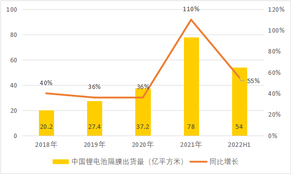 数据显示,2021年中国中国锂电隔膜出货量78亿平米,同比增长超100%;2022年上半年锂电隔膜出货量54亿平米,同比增长超55% [7](该统计口径仅计算基膜出货量)。