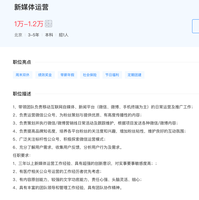 比如说,你锁定了去新媒体运营,搜索到以上职位,会清晰地看到招聘要求和岗位描述,然后逐项对比,综合分析。