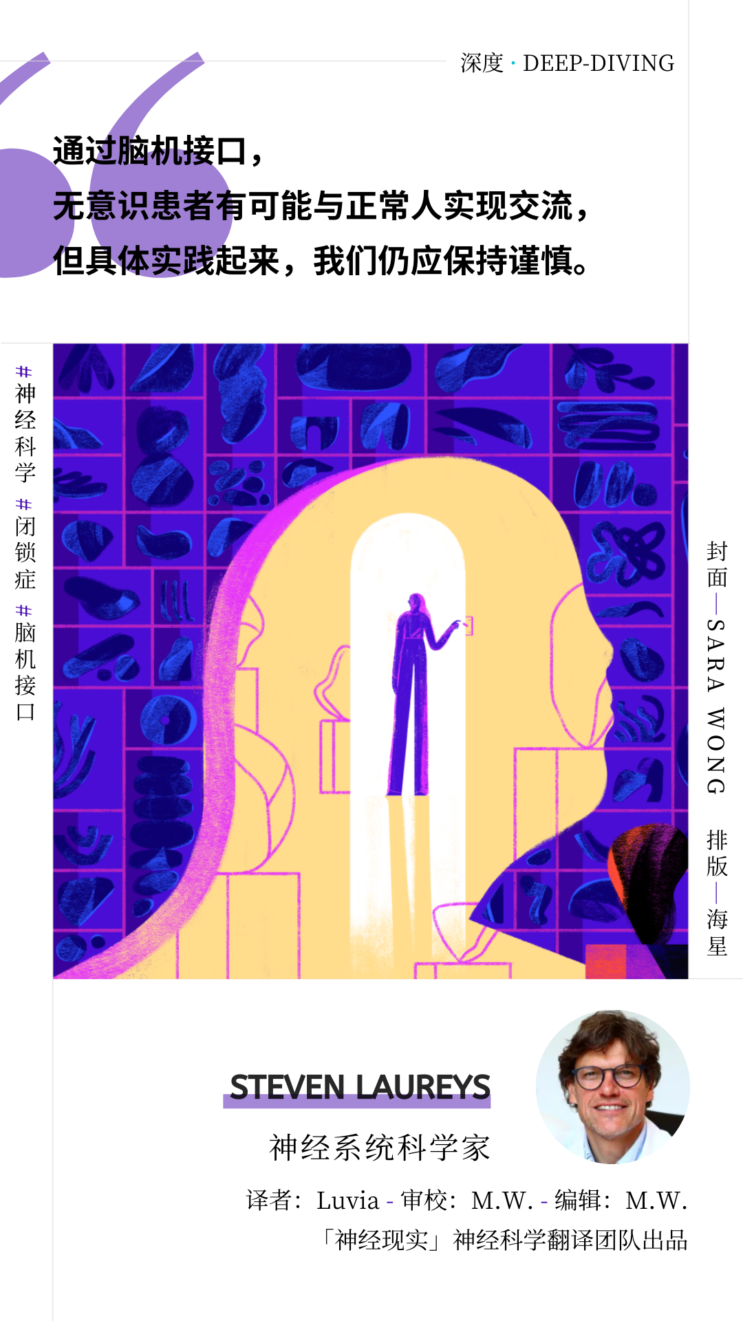 2019年,我在比利时列日大学医院[1]的医疗团队接治了一名21岁的女性,患者刚到医院时被初诊为昏迷,但脑电检查结果却显示,她仍能从一系列随机姓名里对自己的名字做出反应。此外,她的大脑活动还能回应[2]一些简单的问题,这意味着她仍有听觉,能够理解信息,还能执行指令。如果没有这些脑电波证明她虽然处于闭锁状态[3]、无法说话或移动,但大脑却仍有意识[2],她应该会被直接诊断为昏迷或植物人状态。这一发现对这位患者来说至关重要,因为检查结果出来之前,医生已经在和家属商讨患者的临终事宜了。后来,经过积极救治,病人逐渐恢复了过来,现在甚至能够自己控制轮椅活动了。