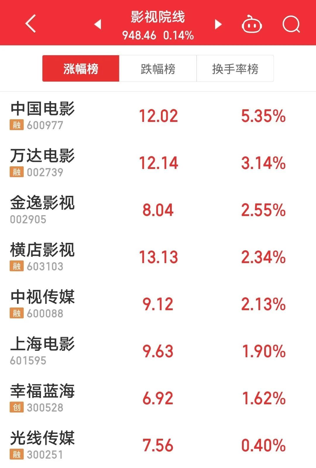 定档消息发布后,提供独家放映CINITY系统的中国电影(SH600977,股价12.02元,市值224.4亿元)股价大涨。万达电影(SZ002739,股价12.14元,市值264.6亿元)、光线传媒(SZ300251,股价7.56元,市值221.8亿元)和横店影视(SH603103,股价13.13元,市值83.3亿元)等影视院线股均有不同程度涨幅。
