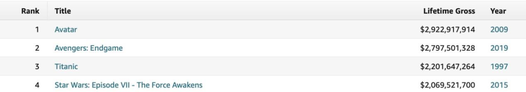 时至今日,全球票房第一影片的纪录依旧由《阿凡达》保持。根据BOX OFFICE MOJO,2009年上映的《阿凡达》票房为29.23亿美元,其次是《复仇者联盟4:终局之战》,票房为27.98亿美元,全球影史票房第三和第四的影片分别是《泰坦尼克号》《星球大战7:原力觉醒》,票房分别为22.02亿美元和20.7亿美元。全球影史票房前四的影片,有两部由卡梅隆导演。