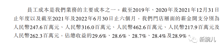 首先是人力成本。据达美乐招股书显示,2019年、2020年、2021年和2021年上旬及2022年上旬,达美乐门店的员工薪资分别是2.47亿、3.16亿、4.63亿、2.18亿和2.62亿,占总营收比的29.6%、28.6%、28.7%、28.4%和28.7%。