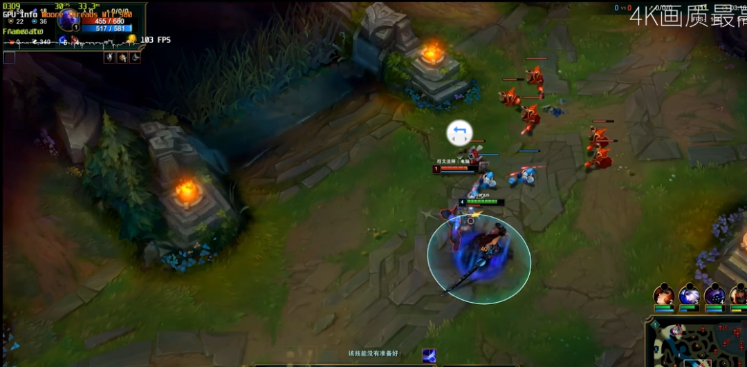 在游戏实战中的发挥也不算稳定,虽然在英雄联盟、 CS : GO 、穿越火线等一系列基于 DX9 开发的游戏上表现还不错,英雄联盟 4K 画质下打团也能在 100 帧左右波动。