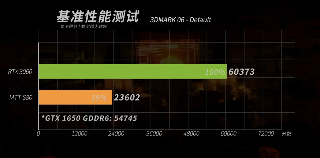 就拿MTT S80 来说,即使用 DX9 能支持的 3DMARK 06 来跑,最后出来的成绩只有 3060 的 39% ,还不到 1660 的一半。。。