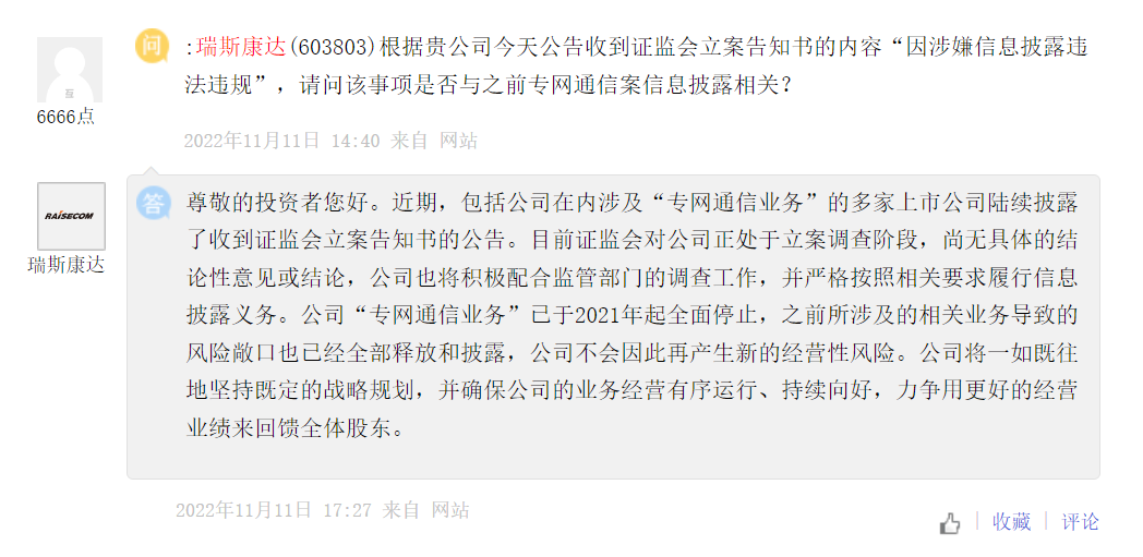 11月11日,瑞斯康达在投资者互动平台回应称,近期包括公司在内涉及"专网通信业务"的多家上市公司,陆续披露了收到证监会立案告知书的公告。目前证监会对公司正处于立案调查阶段,尚无具体的结论性意见或结论,公司也将积极配合监管部门的调查工作,并严格按照相关要求履行信息披露义务。