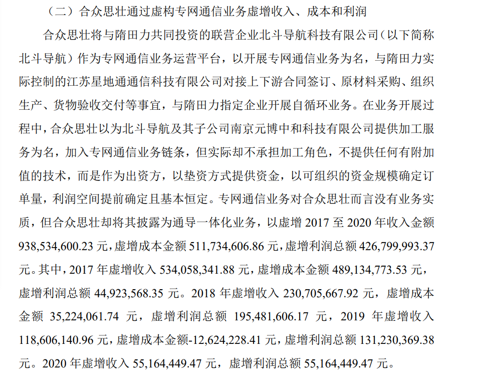 证监会认定,专网通信业务对合众思壮而言没有业务实质,但合众思壮却将其披露为通导一体化业务,以虚增2017至 2020年收入金额 9.39亿元,虚增成本金额 5.1亿元,虚增利润总额 4.27亿元。