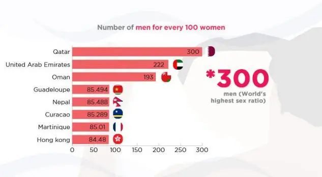 卡塔尔的男女性别比达到了3:1,男人数量是女人的三倍,卡塔尔也因此成为了世界上男女性别比最悬殊的国度。