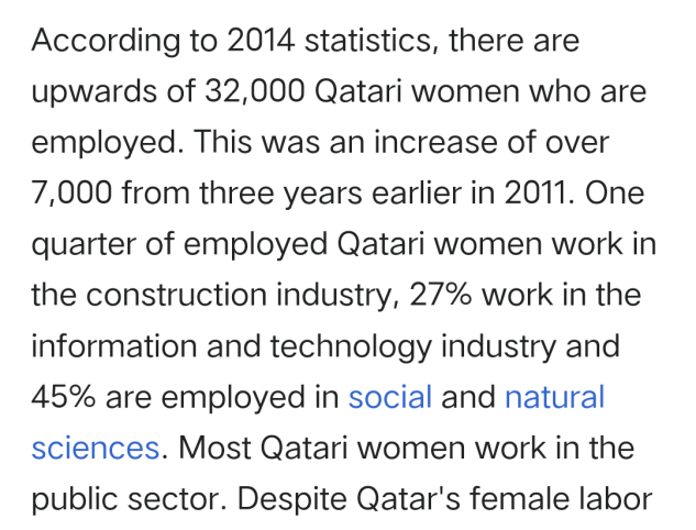 再加上卡塔尔女性也有受教育的权利,使得卡塔尔女性的就业率处于海湾阿拉伯国家的最高位。