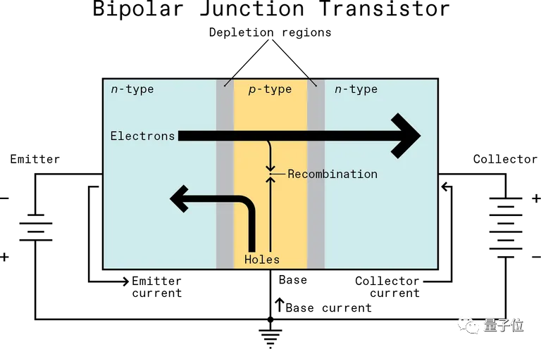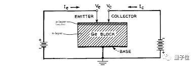 具体来说,这种晶体管基于拇指大小的N型锗板构建,其上带有过量的负电电子,经处理,表面会有一层薄薄的P层,上面带过量正电荷,底部接地。