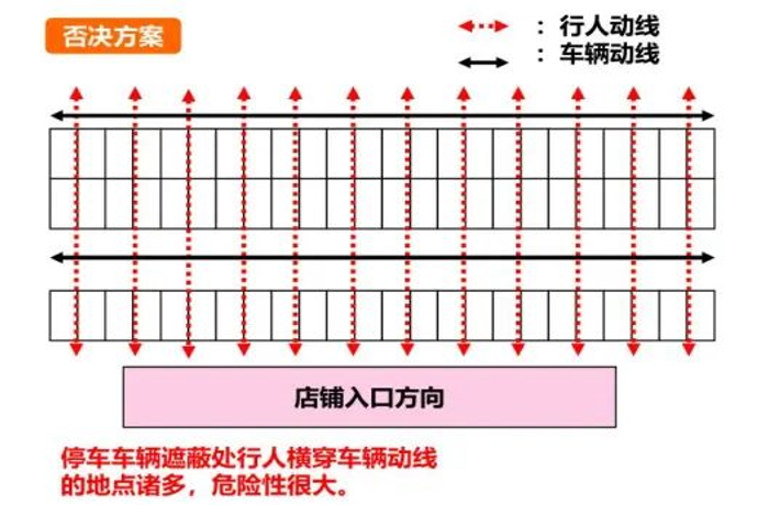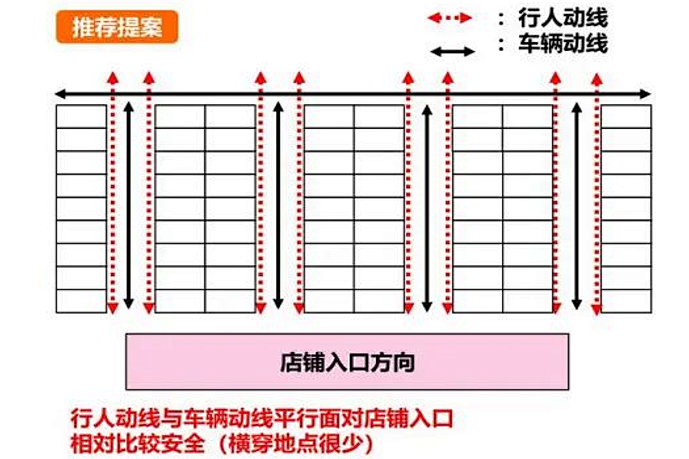 如下图的一个停车场案例,传统将车尾朝向店铺入口方向的做法,容易造成停车动线和人出入动线的交叉,造成一定的安全隐患。