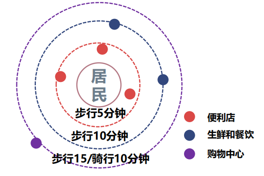 社区商业最大的特点之一就是近地域。5-10-15辐射模型下,拥有稳定的客户群。社区商业处于生活“最后一公里”的圈子,凭借稳定客群的“零距离”的优势,与消费者实现无缝对接,社区居民可以最大限度地“足不出户”满足日常消费需求。