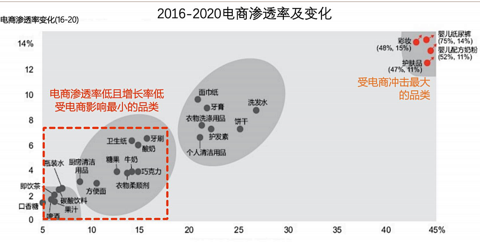 最适合电商的是适合批量采购、低运输损耗、易存储、低频消费品,而与此相对的高频、高时效的生活用品则是电商无法覆盖的。这部分的产品自然需要在线下的社区商业进行购买。