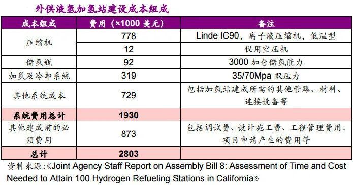 加州能源局研究数据显示,外供液氢加氢站建成所需的与设备相关的费用约为193万美元,考虑到还需要调试、工程设计成本、管理成本、施工成本等诸多成本,总成本约280万美元。