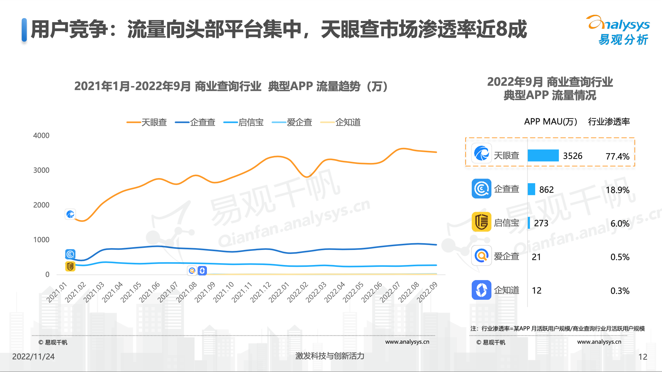 据易观分析的商查报告显示,目前商查行业总体用户规模达到4500万,且流量正在向头部平台集中,天眼查月活用户达到3526万,行业渗透率达到77.4%,远超其他平台。