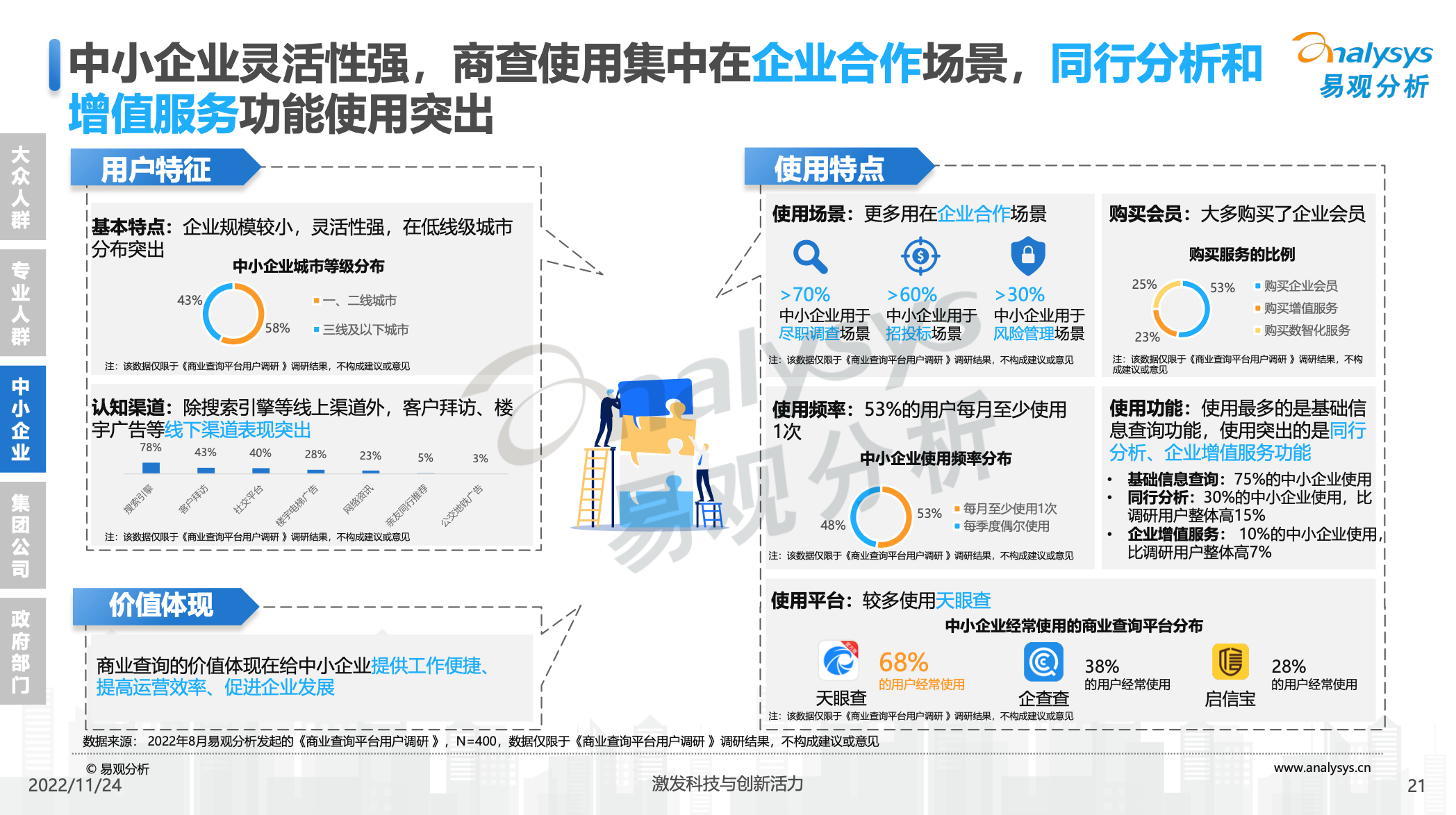 在易观分析发布的商查报告中显示,超过70%的中小企业使用商查服务进行尽职调查、超过60%的中小企业用于招投标场景。53%的中小企业购买了企业会员,23%购买了增值服务,还有25%购买了数智化服务。中小企业最爱使用的商业查询平台为天眼查,有68%的用户使用率。