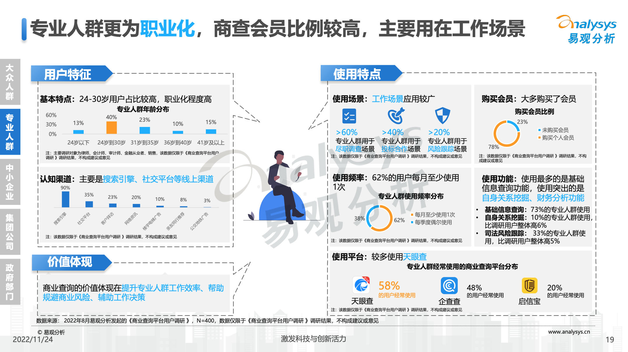 在易观分析发布的商查报告中显示,专业人群有78%购买了会员,62%的用户每月至少使用商查1次,58%的专业人群经常使用天眼查进行商业查询。