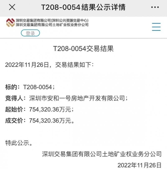 11月11日,深圳公共资源交易中心发布公告,称受转让人委托,以挂牌方式公开转让T208-0054宗地的使用权、地上建筑物、附着物。公告期自2022年11月11日至2022年11月20日,挂牌期自2022年11月21日至2022年11月26日9时止。起始价为754320.36万元。