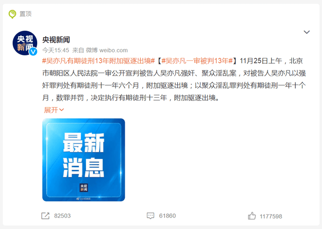 据北京朝阳法院微博消息,2022年11月25日上午,北京市朝阳区人民法院一审公开宣判被告人吴亦凡强奸、聚众淫乱案,对被告人吴亦凡以强奸罪判处有期徒刑十一年六个月,附加驱逐出境;以聚众淫乱罪判处有期徒刑一年十个月,数罪并罚,决定执行有期徒刑十三年,附加驱逐出境。