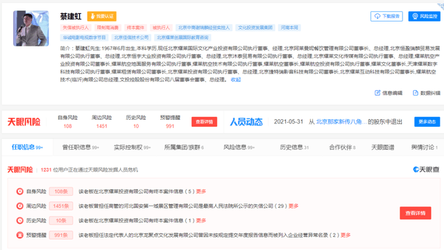 天眼查显示,綦建虹担任着100家公司的法定代表人,是14家公司的股东,在44家公司担任高管,更是实际控制了181家公司。