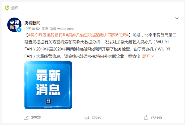 北京市税务局第二稽查局依据《中华人民共和国个人所得税法》《中华人民共和国税收征收管理法》《中华人民共和国行政处罚法》等相关法律法规规定,对吴亦凡(WU YI FAN)追缴税款、加收滞纳金并处罚款,共计6.00亿元。