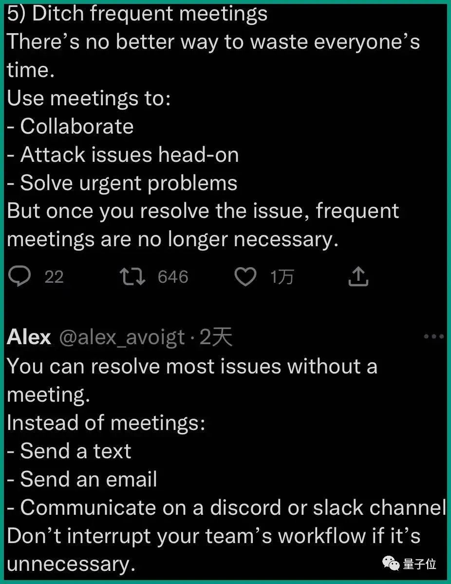 这些建议整体来看,矛头均指向一件事——开会,Alex将它们归结为了6大点。
