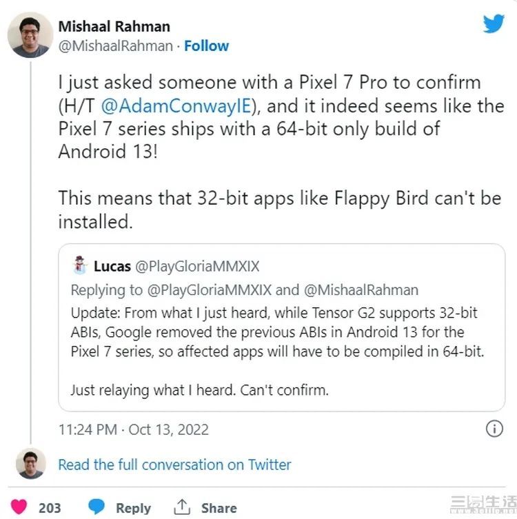 另一方面,从系统的角度来说,如今谷歌更是在“淘汰老代码”的道路上狂奔。举例来说,不久前发布的Pixel 7系列,就已经从系统层面完全封禁了32位应用。近期更有消息指出,谷歌方面大概率将会在2023年把这一策略进行普及,通过Android 14彻底“砍掉”所有ARM v9指令集CPU的32位应用兼容能力。