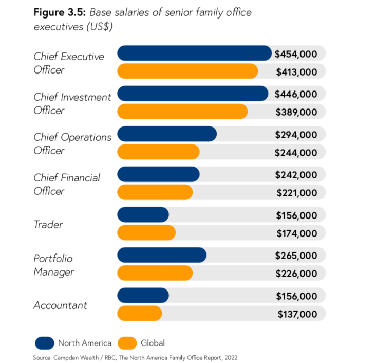 在薪酬方面,北美CEO的每年平均基本工资为45.4万美元(约合人民币326.5万元),其中全球家办平均水平为41.3万美元;CIO的平均基本工资为44.6万美元,COO为29.4万美元,CFO为24.2万美元,交易员为15.6万美元、投资组合经理为26.5万美元和会计师为15.6万美元。值得注意的是,北美家办成员薪酬普遍高于全球平均水平。此外,家办员工的奖金大约为基本工资的14%到48%不等,大多数是由家族自由裁量。