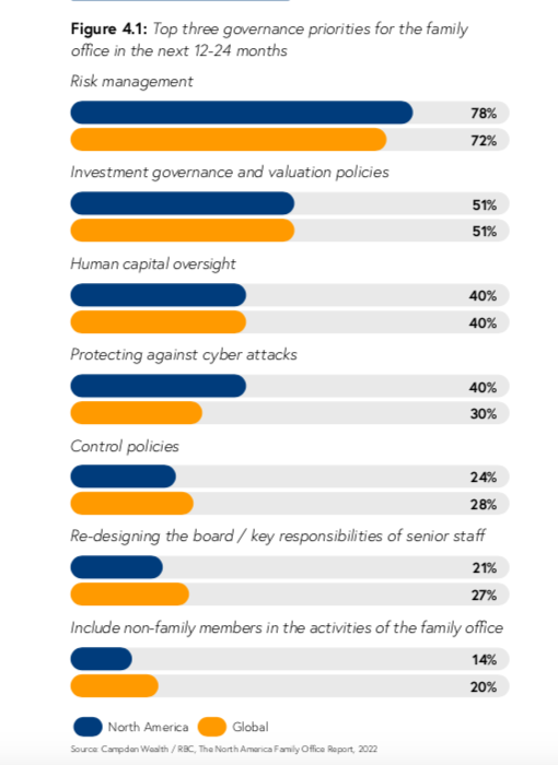 近日,海外研究机构发布的《2022北美家办报告》显示,78%的受访者(表示,未来12至24个月,家办的首要治理重点是风险管理。其中,投资风险被认为是未来三到五年家办面临的最大风险。