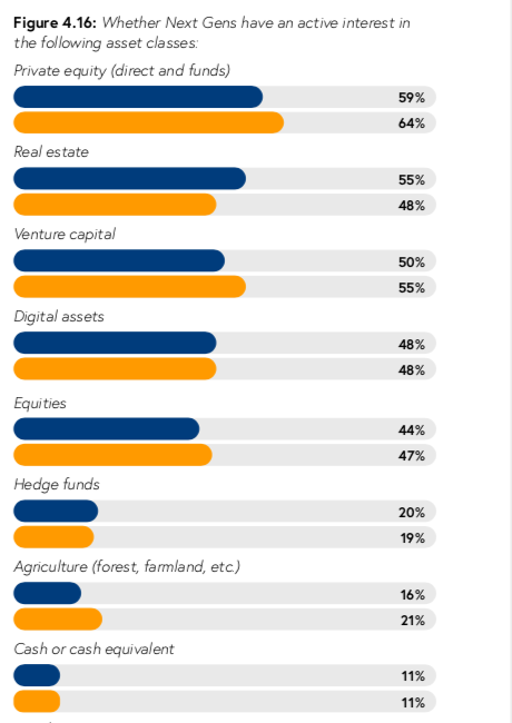 当被问及下一代成员最感兴趣的资产类别时,排名前五的是私募股权(59%感兴趣)、房地产(55%)、风险投资(50%)、数字资产(48%)和股票(44%)。