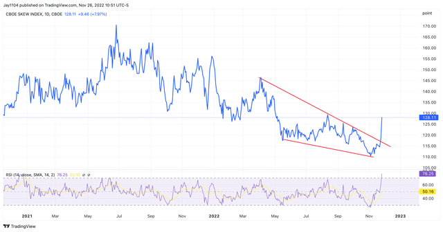 但有迹象表明,市场预期发生了转变,以VVIX指数衡量,VIX的隐含波动率开始爬升。购买保护措施和进行对冲也是异常便宜的。自11月22日以来,VVIX指数开始走高,这是隐含波动率上升的第一个迹象,交易商正在寻求建立对冲。