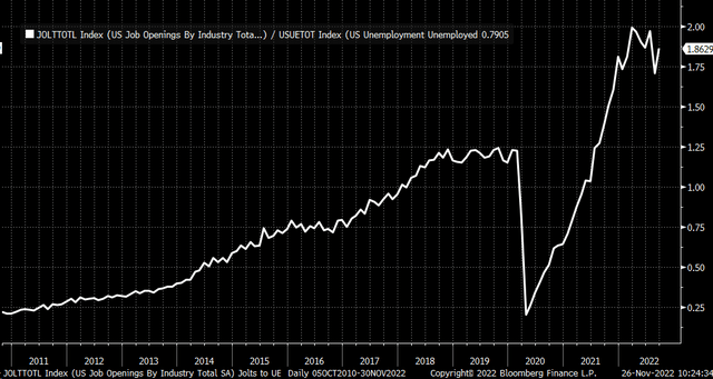 这些只是小样本,但也说明了为什么美联储不能让金融条件继续宽松,需要它们再次收紧到10月的水平,然后要求它们保持在那里。除此之外,虽然申请失业救济金的人数已经开始上升,但与失业人数相比,职位空缺的数量仍然非常高,几乎是2比1的比例。它仍然明显高于大流行之前的数值,大约是1.25。