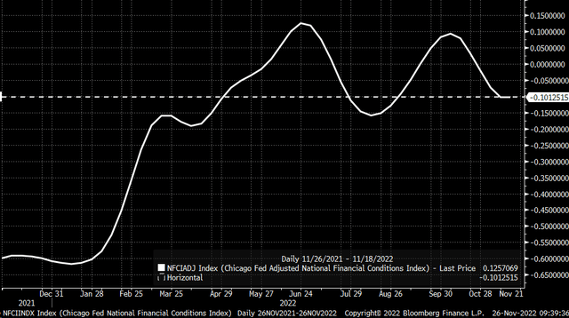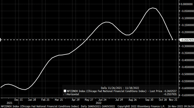 美联储通过前瞻性指导、量化紧缩和利率来传递其货币政策。这些因素加在一起有助于收紧或放松金融条件。在他发表杰克逊霍尔演讲之后,金融条件立即大幅收紧,但自10月份的CPI报告以来,金融条件已大幅放松。