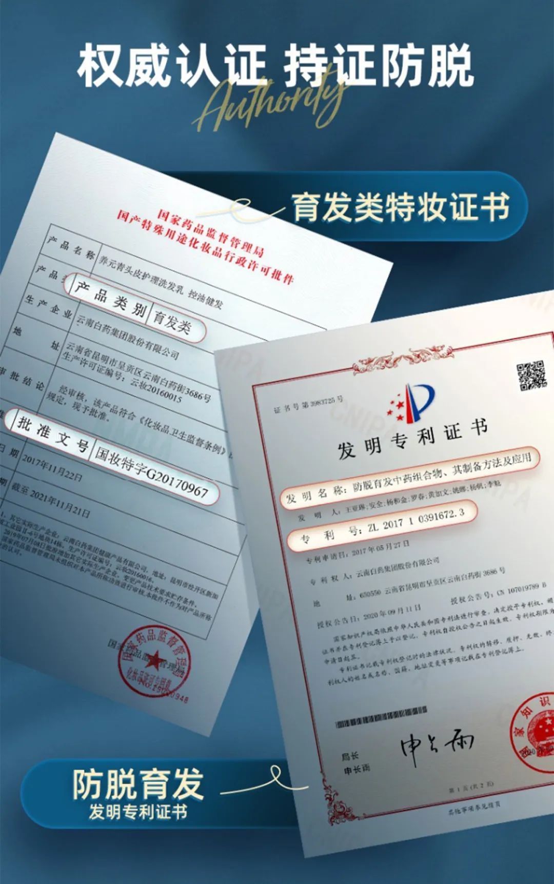 其次,养元青的产品拓展建立在其本身的医药科技基础上,保持着自己挖掘天然药⽤植物精粹的技术及产品特色。产品成分不再局限于大众熟知的“生姜养发”,深入挖掘侧柏叶、皮哨子、青刺果油、三七、川芎等药用植物的养护价值。技术获得防脱育发专利,产品持有国家特妆证书 ,从供给端实现对于安全、有效的“成分党”供给,从产品力方面改善头皮健康,实力防脱。